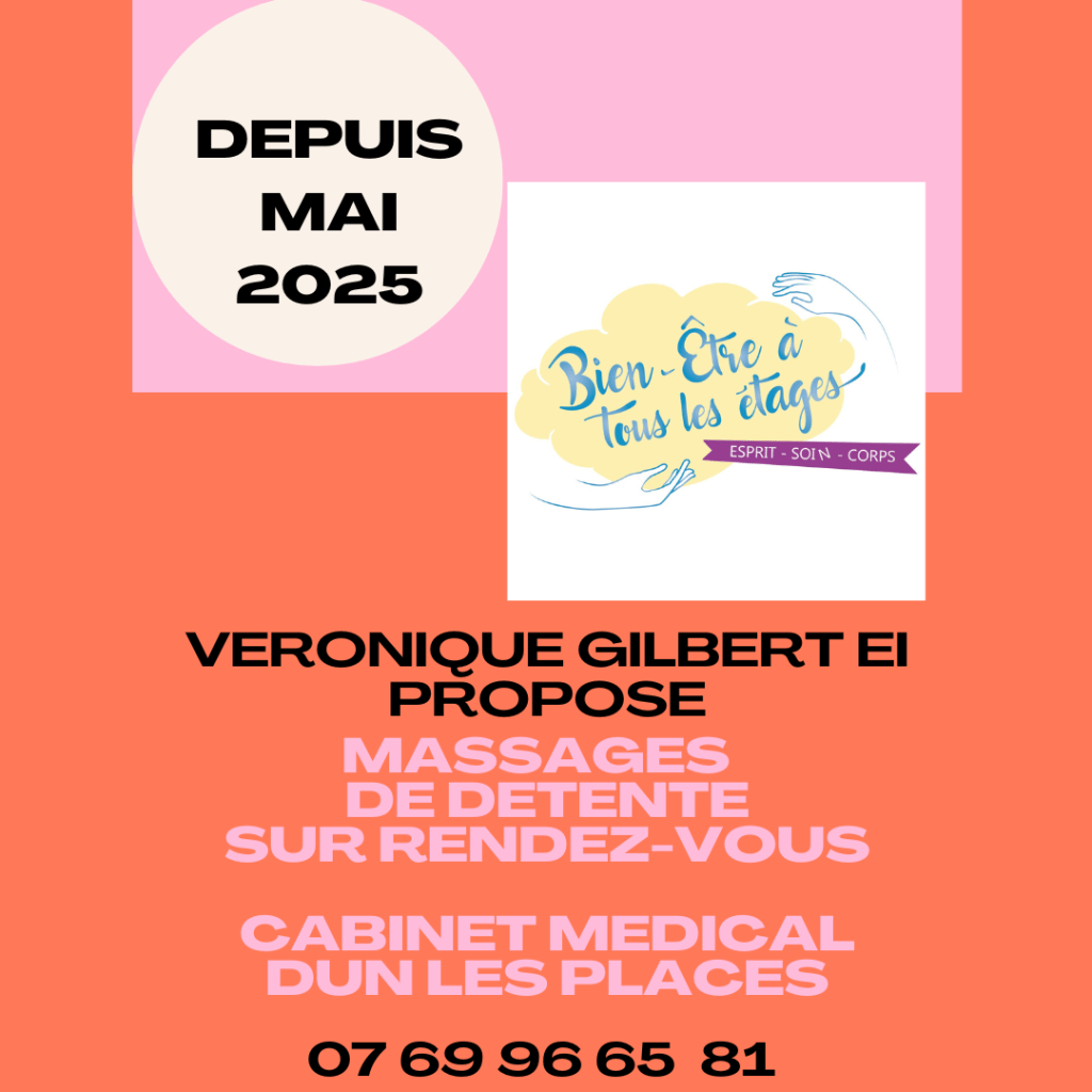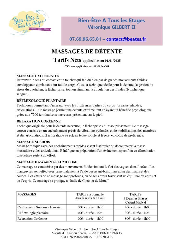 | MASSAGES | TARIF à domicile dans un rayon de 10kms | TARIF Cabinet Médical à DUN LES PLACES depuis mai 2025 |