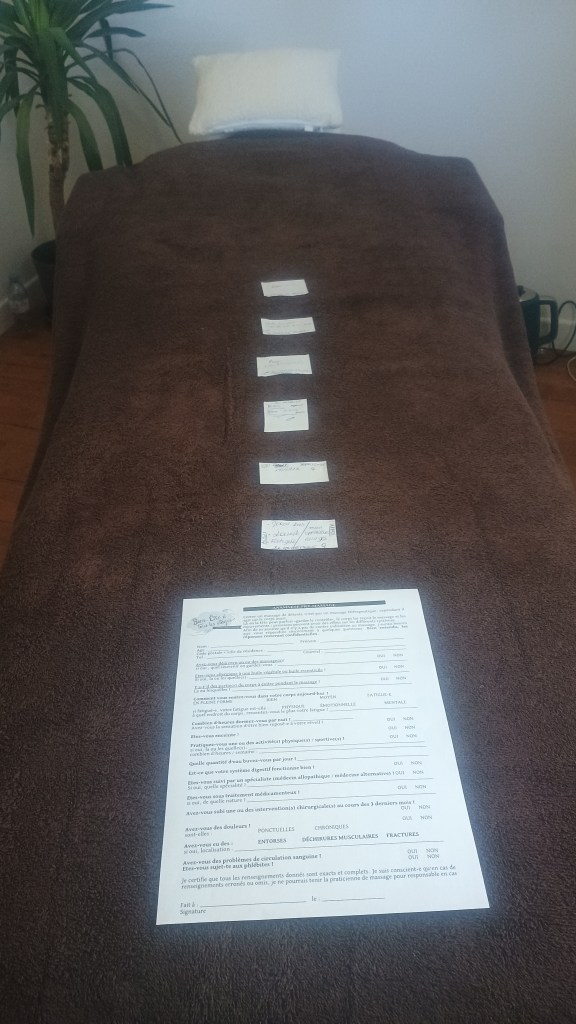 Il est à noter que la praticienne procède systématiquement à une collecte d’informations auprès du client avant de commencer la séance. Ces renseignements serviront, entre autre, à identifier les contre-indications au massage. Ce faisant, la praticienne pourra orienter son client vers la ressource médicale appropriée ou encore ajuster le soin en conséquence afin d’en assurer la sécurité.